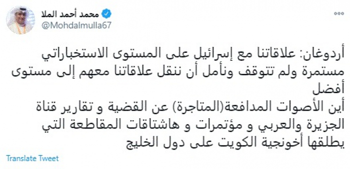 وقال في تغريدة عبر "تويتر" رصدها "المشهد العربي": "أردوغان: علاقاتنا مع إسرائيل على المستوى الاستخباراتي مستمرة ولم تتوقف ونأمل أن ننقل علاقاتنا معهم إلى مستوى أفضل.. أين الأصوات المدافعة (المتاجرة) عن القضية و تقارير قناة الجزيرة والعربي ومؤتمرات وهاشتاقات المقاطعة التي يطلقها أخونجية الكويت على دول الخليج".