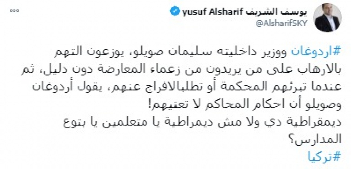 وشدد في تغريدة على حسابه بموقع التدوين المصغر تويتر، اليوم على أن: "أردوغان ووزير داخليته سليمان صويلو، يوزعون التهم بالإرهاب على من يريدون من زعماء المعارضة دون دليل، ثم عندما تبرئهم المحكمة أو تطلب الإفراج عنهم، يقول أردوغان وصويلو أن أحكام المحاكم لا تعنيهم".
