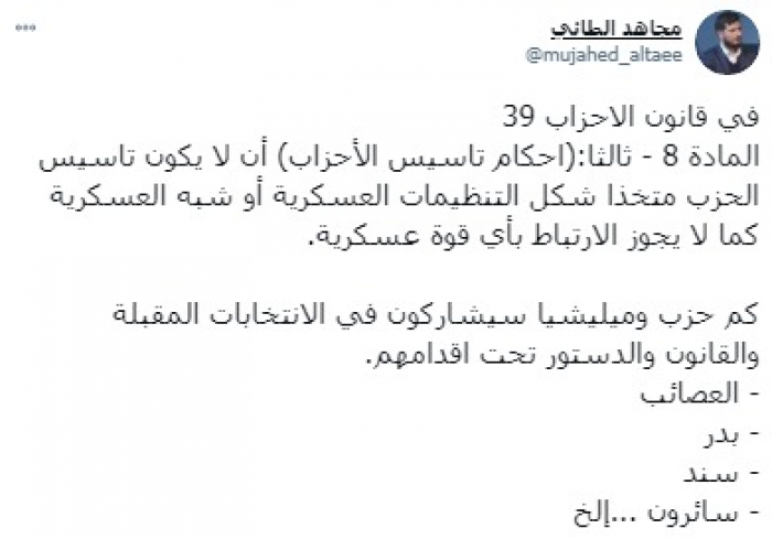 وتساءل: "كم حزب وميليشيا سيشاركون في الانتخابات المقبلة والقانون والدستور تحت أقدامهم"، مشيرا إلى مليشيا: "العصائب - بدر - سند – سائرون ...ألخ".