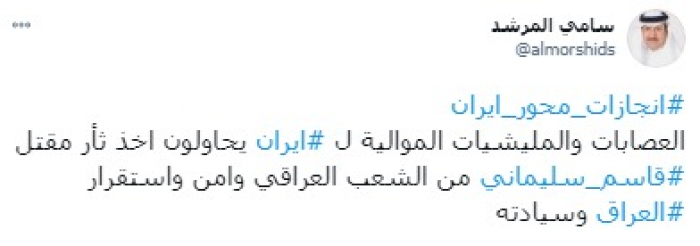 وقال في تغريدة على حسابه بموقع التدوين المصغر تويتر، اليوم إن: "إنجازات محور إيران، العصابات والمليشيات الموالية لإيران يحاولون أخذ ثأر مقتل قاسم سليماني من الشعب العراقي وأمن واستقرار العراق وسيادته".