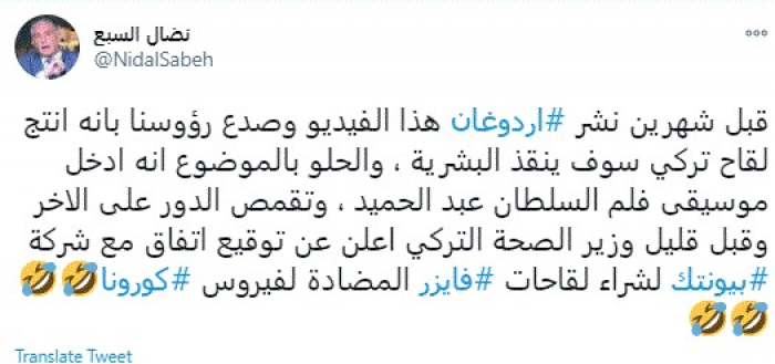 وقال في تغريدة عبر "تويتر" رصدها "المشهد العربي": "قبل شهرين نشر أردوغان هذا الفيديو وصدع رؤوسنا بأنه أنتج لقاح تركي سوف ينقذ البشرية، والحلو بالموضوع أنه أدخل موسيقى فلم السلطان عبد الحميد، وتقمص الدور على الآخر وقبل قليل وزير الصحة التركي أعلن عن توقيع اتفاق مع شركة بيونتك لشراء لقاحات فايزر المضادة لفيروس كورونا".