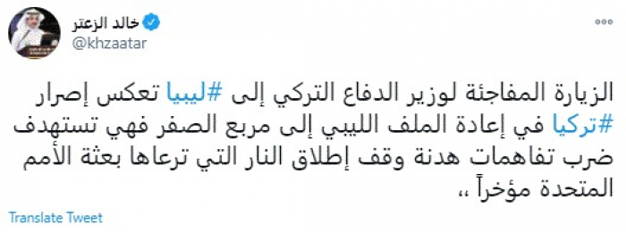 وقال في تغريدة عبر "تويتر" رصدها "المشهد العربي": "الزيارة المفاجئة لوزير الدفاع التركي إلى ليبيا تعكس إصرار تركيا في إعادة الملف الليبي إلى مربع الصفر فهي تستهدف ضرب تفاهمات هدنة وقف إطلاق النار التي ترعاها بعثة الأمم المتحدة مؤخراً".