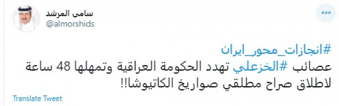 وقال في تغريدة عبر "تويتر" رصدها "المشهد العربي": "إنجازات محور إيران عصائب الخزعلي تهدد الحكومة العراقية وتمهلها 48 ساعة لاطلاق صراح مطلقي صواريخ الكاتيوشا".