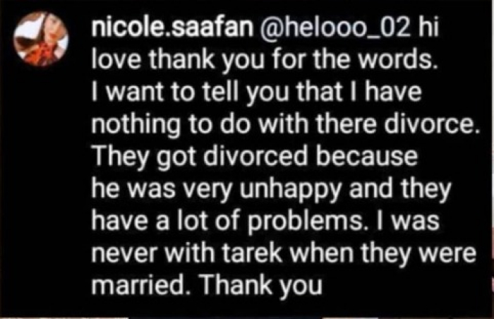 ولم تقف نيكول سعفان صامتة إزاء تلك الاتهامات حيث نفت ما ألصقه بها الجمهور.، وذلك عبر تعليق لها ردًا على التعليقات الهجومية التي تلقتها على صورة نشرتها في حسابها عبر “إنستجرام” مؤكدًة أنها لم تكن سببًا في طلاق طارق وأصالة وأن الأول لم يكن سعيدًا في حياته.