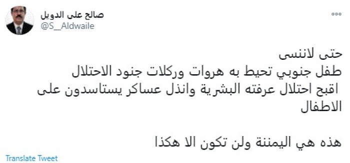 وقال في تغريدة عبر "تويتر" رصدها "المشهد العربي": "حتى لا ننسى طفل جنوبي تحيط به هروات وركلات جنود الاحتلال أقبح احتلال عرفته البشرية وانذل عساكر يستأسدون على الأطفال هذه هي اليمننة ولن تكون إلا هكذا".