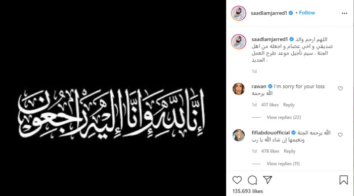 ونعى لمجرد، والد صديقه عبر حسابه على موقع "إنستجرام"، وكتب: "اللهم أرحم والد صديقي وأخي عصام، وأجعله من أهل الجنة.. سيتم تأجيل موعد طرح العمل الجديد".