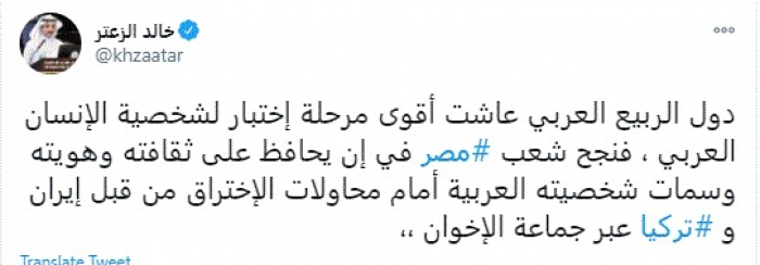 وكتب في تغريدة عبر "تويتر" رصدها "المشهد العربي": "دول الربيع العربي عاشت أقوى مرحلة إختبار لشخصية الإنسان العربي، فنجح شعب مصر في إن يحافظ على ثقافته وهويته وسمات شخصيته العربية أمام محاولات الإختراق من قبل إيران وتركيا عبر جماعة الإخوان".