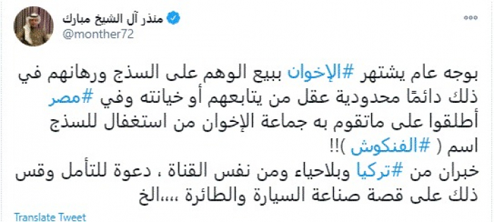 وكتب في تغريدة عبر "تويتر" رصدها "المشهد العربي": "بوجه عام يشتهر الإخوان ببيع الوهم على السذج ورهانهم في ذلك دائمًا محدودية عقل من يتابعهم أو خيانته وفي مصر أطلقوا على ماتقوم به جماعة الإخوان من استغفال للسذج اسم (الفنكوش)".