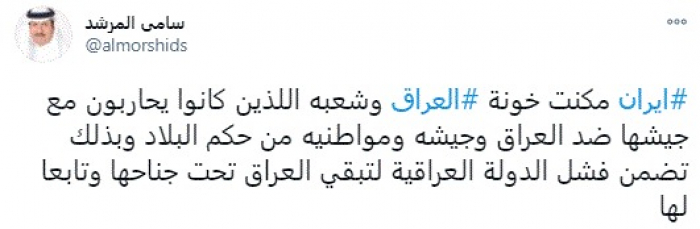وقال في تغريدة عبر "تويتر" رصدها "المشهد العربي": "إيران مكنت خونة العراق وشعبه اللذين كانوا يحاربون مع جيشها ضد العراق وجيشه ومواطنيه من حكم البلاد وبذلك تضمن فشل الدولة العراقية لتبقي العراق تحت جناحها وتابعا لها".