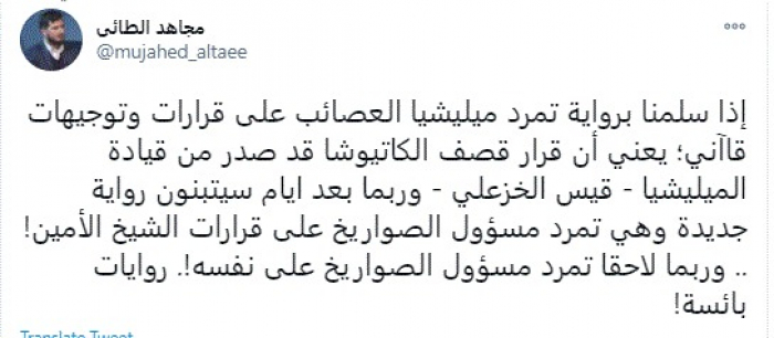وقال في تغريدة عبر "تويتر" رصدها "المشهد العربي": "إذا سلمنا برواية تمرد ميليشيا العصائب على قرارات وتوجيهات قاآني؛ يعني أن قرار قصف الكاتيوشا قد صدر من قيادة الميليشيا - قيس الخزعلي - وربما بعد ايام سيتبنون رواية جديدة وهي تمرد مسؤول الصواريخ على قرارات الشيخ الأمين! .. وربما لاحقا تمرد مسؤول الصواريخ على نفسه!. روايات بائسة".