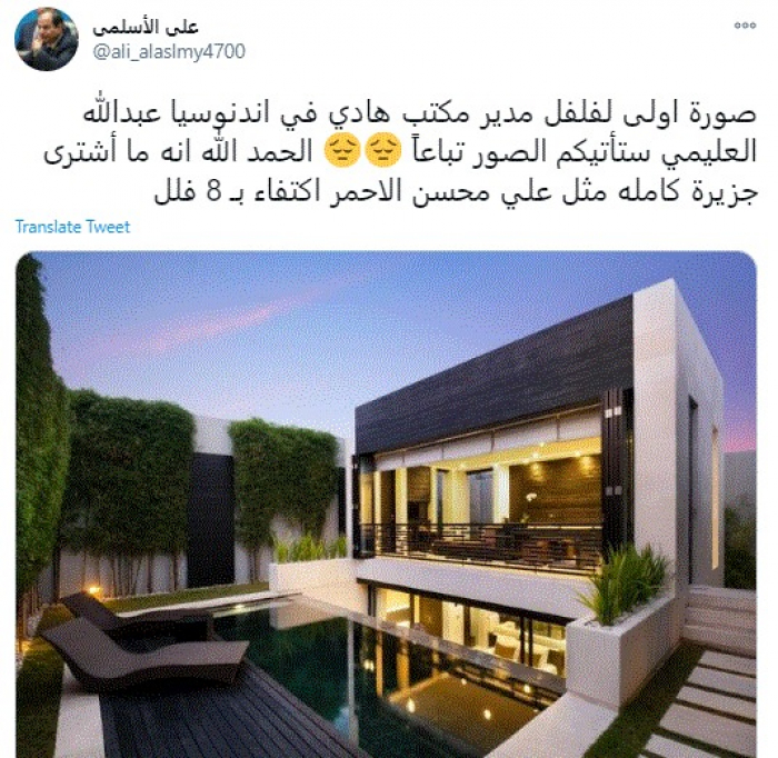 وقال في تغريدة عبر "تويتر" رصدها "المشهد العربي": "صورة أولى لفيلا مدير مكتب هادي في إندونيسيا عبدالله العليمي ستأتيكم الصور تباعًا.. الحمد الله أنه ما اشترى جزيرة كاملة مثل علي محسن الأحمر اكتفاء بـ 8 فلل".