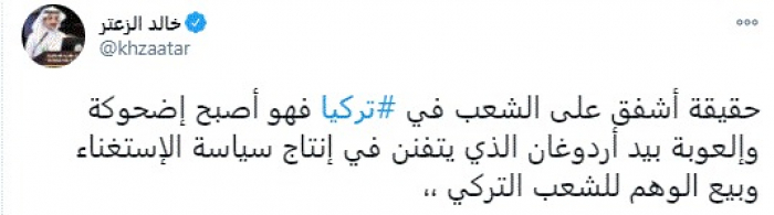 وكتب في تغريدة عبر "تويتر" رصدها "المشهد العربي": "حقيقة أشفق على الشعب في تركيا فهو أصبح إضحوكة وإلعوبة بيد أردوغان الذي يتفنن في إنتاج سياسة الإستغناء وبيع الوهم للشعب التركي".