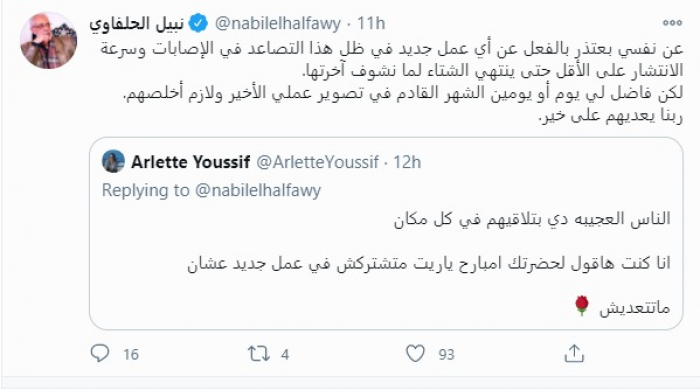 وكتب الحلفاوي، عبر حسابه على تويتر، قائلاً : "عن نفسي بعتذر بالفعل عن أي عمل جديد في ظل هذا التصاعد في الإصابات وسرعة الانتشار على الأقل حتى ينتهي الشتاء لما نشوف آخرتها" .
