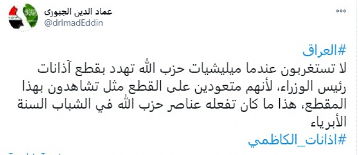وقال في تغريدة عبر "تويتر" رصدها "المشهد العربي": "لا تستغربون عندما ميليشيات حزب الله تهدد بقطع آذانات رئيس الوزراء، لأنهم متعودين على القطع مثل تشاهدون بهذا المقطع، هذا ما كان تفعله عناصر حزب الله في الشباب السنة الأبرياء".