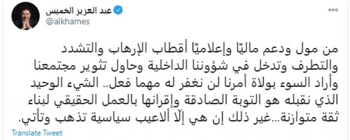 وقال في تغريدة عبر "تويتر" رصدها "المشهد العربي": "من مول ودعم ماليًا وإعلاميًا أقطاب الإرهاب والتشدد والتطرف وتدخل في شؤوننا الداخلية وحاول تثوير مجتمعنا وأراد السوء بولاة أمرنا لن نغفر له مهما فعل.. الشيء الوحيد الذي نقبله هو التوبة الصادقة وإقرانها بالعمل الحقيقي لبناء ثقة متوازنة...غير ذلك إن هي إلّا ألاعيب سياسية تذهب وتأتي".