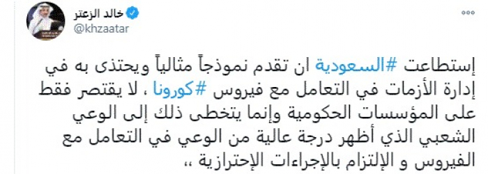وكتب في تغريدة عبر "تويتر" رصدها "المشهد العربي": "استطاعت السعودية ان تقدم نموذجاً مثالياً ويحتذى به في إدارة الأزمات في التعامل مع فيروس كورونا ، لا يقتصر فقط على المؤسسات الحكومية وإنما يتخطى ذلك إلى الوعي الشعبي الذي أظهر درجة عالية من الوعي في التعامل مع الفيروس و الإلتزام بالإجراءات الإحترازية".