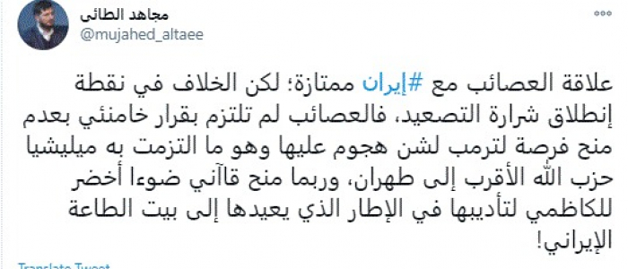وقال في تغريدة عبر "تويتر" رصدها "المشهد العربي": "علاقة العصائب مع إيران ممتازة؛ لكن الخلاف في نقطة إنطلاق شرارة التصعيد، فالعصائب لم تلتزم بقرار خامنئي بعدم منح فرصة لترمب لشن هجوم عليها وهو ما التزمت به ميليشيا حزب الله الأقرب إلى طهران، وربما منح قاآني ضوءا أخضر للكاظمي لتأديبها في الإطار الذي يعيدها إلى بيت الطاعة الإيراني".