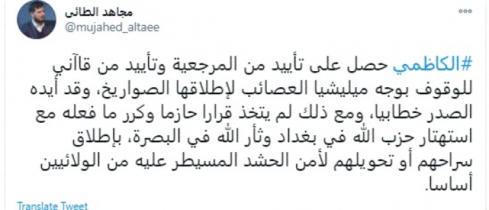 وكتب في تغريدة عبر "تويتر" رصدها "المشهد العربي": "الكاظمي حصل على تأييد من المرجعية وتأييد من قاآني للوقوف بوجه ميليشيا العصائب لإطلاقها الصواريخ، وقد أيده الصدر خطابيا، ومع ذلك لم يتخذ قرارا حازما وكرر ما فعله مع استهتار حزب الله في بغداد وثأر الله في البصرة، بإطلاق سراحهم أو تحويلهم لأمن الحشد المسيطر عليه من الولائيين أساسا.".