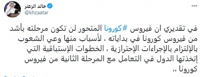 وكتب في تغريدة عبر "تويتر" رصدها "المشهد العربي": "في تقديري أن فيروس كورونا المتحور لن تكون مرحلته بأشد من فيروس كورونا في بداياته ، لأسباب منها وعي الشعوب بالإلتزام بالإجراءات الاحترازية، الخطوات الإستباقية التي اتخذتها الدول في التعامل مع المرحلة الثانية من فيروس كورونا".