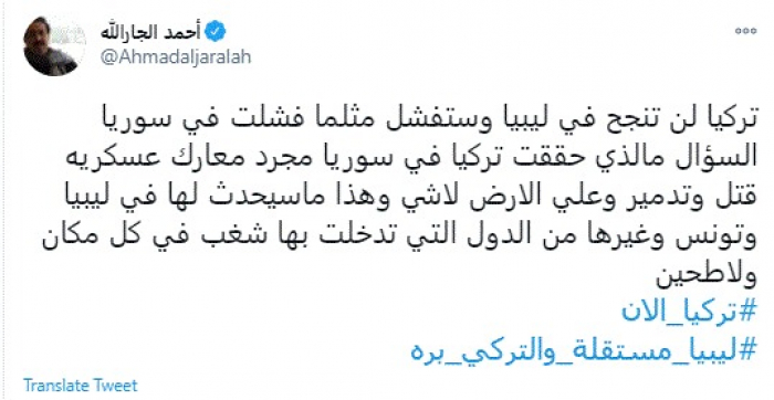 وكتب في تغريدة عبر "تويتر" رصدها "المشهد العربي": "تركيا لن تنجح في ليبيا وستفشل مثلما فشلت في سوريا السؤال ما الذي حققت تركيا في سوريا مجرد معارك عسكرية قتل وتدمير وعلى الأرض لا شي وهذا ما سيحدث لها في ليبيا وتونس وغيرها من الدول التي تدخلت بها شغب في كل مكان ولا طحين".