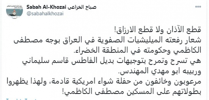 وقال في تغريدة عبر "تويتر" رصدها "المشهد العربي": "قطع الآذان ولا قطع الأرزاق! شعار رفعته الميليشيات الصفوية في العراق بوجه مصطفى الكاظمي وحكومته في المنطقة الخضراء. هي تسرح وتمرح بتوجيهات بديل الفاطس قاسم سليماني وربيبه أبو مهدي المهندس".