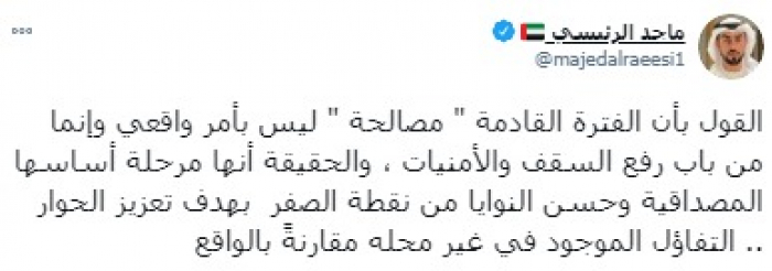 وأوضح في تغريدة على حسابه بموقع التدوين المصغر تويتر، اليوم أن: "القول بأن الفترة القادمة (مصالحة) ليس بأمر واقعي وإنما من باب رفع السقف والأمنيات".