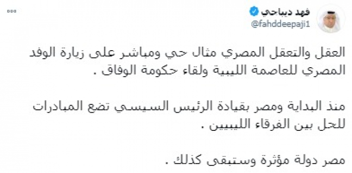 وقال في تغريدة على حسابه بموقع التدوين المصغر تويتر، اليوم إن: "العقل والتعقل المصري مثال حي ومباشر على زيارة الوفد المصري للعاصمة الليبية ولقاء حكومة الوفاق".