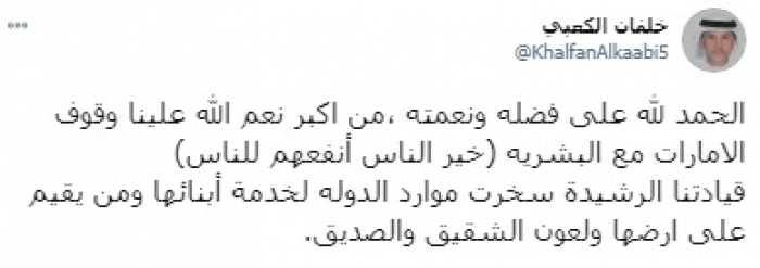 وقال في تغريدة على حسابه بموقع التدوين المصغر تويتر، اليوم إنه: "الحمد لله على فضله ونعمته، من أكبر نعم الله علينا وقوف الإمارات مع البشرية (خير الناس أنفعهم للناس)".
