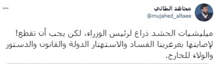 وشدد في تغريدة على حسابه بموقع التدوين المصغر تويتر، اليوم على أن: "ميليشيات الحشد ذراع لرئيس الوزراء، لكن يجب أن تقطع!".