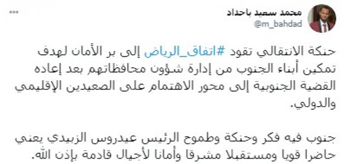 وأوضح في تغريدة على حسابه بموقع التدوين المصغر تويتر، اليوم أن: "حنكة الانتقالي تقود اتفاق الرياض إلى بر الأمان لهدف تمكين أبناء الجنوب من إدارة شؤون محافظاتهم بعد إعاده القضية الجنوبية إلى محور الاهتمام على الصعيدين الإقليمي والدولي".