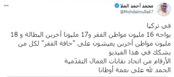 وقال في تغريدة على حسابه بموقع التدوين المصغر تويتر، اليوم إنه: "في تركيا يواجه 16 مليون مواطن الفقر و17 مليونا آخرين البطالة و18 مليون مواطن آخرين يعيشون على (حافة الفقر)".