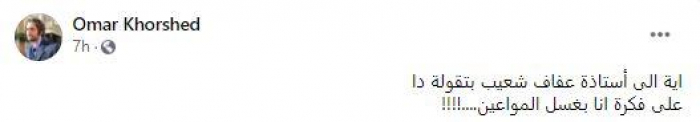 وكتب خورشيد، عبر حسابه الشخصي بموقع "فيسبوك": "إيه اللي أستاذة عفاف شعيب بتقوله ده؟ على فكرة أنا بغسل المواعين!".