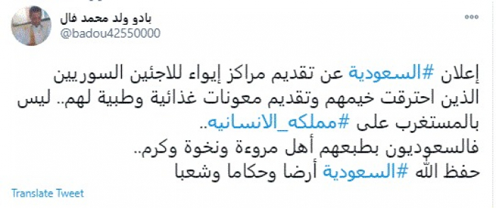 أشاد الكاتب الصحفي الموريتاني بادو ولد محمد فال، اليوم، بإعلان السعودية لتقديم معونات لدعم مراكز إيواء اللاجئين السوريين الذين احترقت مخيماتهم في لبنان.