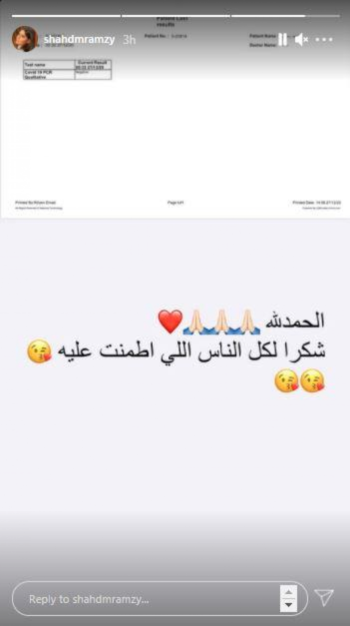 ونشرت شهد صورة من مسحة كورونا التي أجرتها وجاءت النتيجة سلبية، وعلّقت عبر حسابها على موقع "إنستجرام"، وعلّقت: "الحمد لله.. شكرا لكل الناس اللي اتطمنت عليّا".