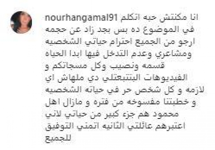 أضافت "نورهان": "الحياة قسمة ونصيب وكل رسائلكم والفيديوهات اللي بتتبعت لي دي ملهاش أي لازمة، وكل شخص حر في حياته الشخصية، وخطوبتنا مفسوخة من فترة، ومازال أهل محمود هم جزء كبير من حياتي لأني أعتبرهم عائلتي الثانية، أتمنى التوفيق للجميع".