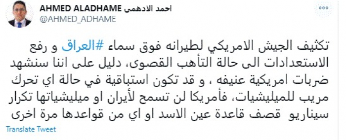وقال في تغريدة عبر "تويتر" رصدها "المشهد العربي": "تكثيف الجيش الأمريكي لطيرانه فوق سماء العراق ورفع الاستعدادات إلى حالة التأهب القصوى، دليل على أننا سنشهد ضربات أمريكية عنيفة، و قد تكون استباقية في حالة أي تحرك مريب للمليشيات، فأمريكا لن تسمح لإيران أو مليشياتها تكرار سيناريو قصف قاعدة عين الأسد أو أي من قواعدها مرة أخرى".