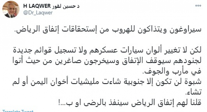 وكتب في تغريدة عبر "تويتر" رصدها "المشهد العربي": "سيراوغون ويتذاكون للهروب من استحقاقات اتفاق الرياض. لكن لا تغيير ألوان سيارات عسكرهم ولا تسجيل قوائم جديدة لجنودهم سيوقف الاتفاق وسيخرجون صاغرين من حيث أتوا في مأرب والجوف".