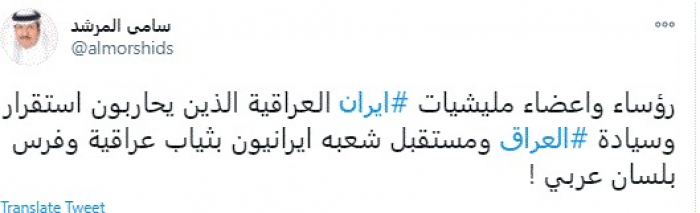 وقال في تغريدة عبر "تويتر" رصدها "المشهد العربي": "رؤساء وأعضاء مليشيات إيران العراقية الذين يحاربون استقرار وسيادة العراق ومستقبل شعبه إيرانيون بثياب عراقية وفرس بلسان عربي".