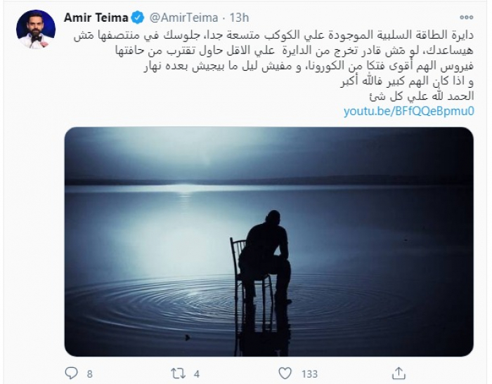 ونصح طعيمة جمهوره عبر تغريدة، بحسابه بموقع "تويتر" قائلًا: "دايرة الطاقة السلبية الموجودة على الكوكب متسعة جدا، جلوسك في منتصفها مَش هيساعدك، لو مَش قادر تخرج من الدايرة على الاقل حاول تقترب من حافتها".