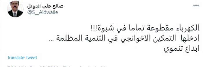 وقال في تغريدة عبر "تويتر" رصدها "المشهد العربي": "الكهرباء مقطوعة تمامًا في شبوة! أدخلها التمكين الإخوانجي في التنمية المظلمة. إبداع تنموي".