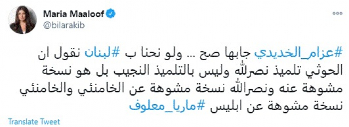 وكتبت في تغريدة عبر "تويتر" رصدها "المشهد العربي": "عزام الخديدي جابها صح ... ولو نحنا بلبنان نقول أن الحوثي تلميذ نصرلله وليس بالتلميذ النجيب بل هو نسخة مشوهة عنه ونصرالله نسخة مشوهة عن الخامنئي والخامنئي نسخة مشوهة عن إبليس".