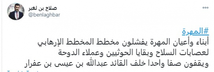 وأوضح: "أبناء وأعيان المهرة يفشلون مخطط المخطط الإرهابي لعصابات السلاح وبقايا الحوثيين وعملاء الدوحة ويقفون صفًا واحدًا خلف القائد عبدالله بن عيسى بن عفرار".