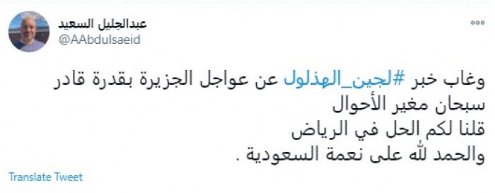 وقال في تغريدة عبر "تويتر" رصدها "المشهد العربي": "وغاب خبر لجين الهذلول عن عواجل الجزيرة بقدرة قادر سبحان مغير الأحوال قلنا لكم الحل في الرياض والحمد لله على نعمة السعودية".
