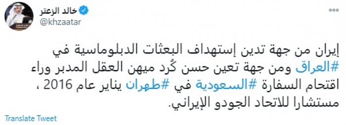 وقال في تغريدة عبر "تويتر" رصدها "المشهد العربي": "إيران من جهة تدين إستهداف البعثات الدبلوماسية في العراق ومن جهة تعين حسن كُرد ميهن العقل المدبر وراء اقتحام السفارة السعودية في طهران يناير عام 2016 ، مستشارا للاتحاد الجودو الإيراني".
