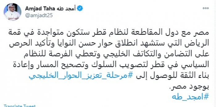 وقال في تغريدة عبر "تويتر" رصدها "المشهد العربي": "مصر مع دول المقاطعة لنظام قطر ستكون متواجدة في قمة الرياض التي ستشهد انطلاق حوار حسن النوايا وتأكيد الحرص على التضامن والتكاتف الخليجي وتعطي الفرصة للنظام السياسي في قطر لتصويب السلوك وتصحيح المسار وإعادة بناء الثقة للوصول إلى مرحلة تعزيز الحوار الخليجي بوجود مصر".