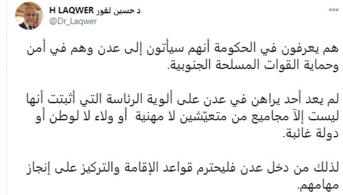 وأوضح: "لذلك من دخل عدن فليحترم قواعد الإقامة والتركيز على إنجاز مهامهم".