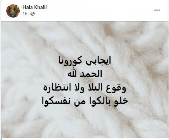 وكتبت "هالة" عبر حسابها الشخصي بموقع "فيسبوك": "إيجابي كورونا.. الحمد لله.. وقوع البلا ولا انتظاره.. خلوا بالكوا من نفسكوا".