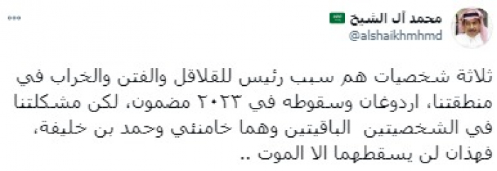 وشدد في تغريدة على حسابه بموقع التدوين المصغر تويتر، اليوم على أن هناك: "ثلاثة شخصيات هم سبب رئيس للقلاقل والفتن والخراب في منطقتنا".