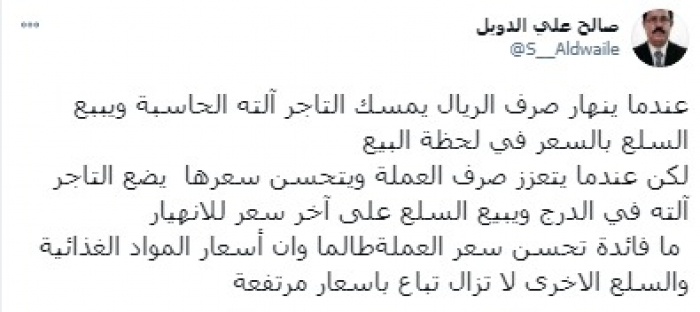 وأوضح في تغريدة على حسابه بموقع التدوين المصغر تويتر، اليوم أنه: "عندما ينهار صرف الريال يمسك التاجر آلته الحاسبة ويبيع السلع بالسعر في لحظة البيع".
