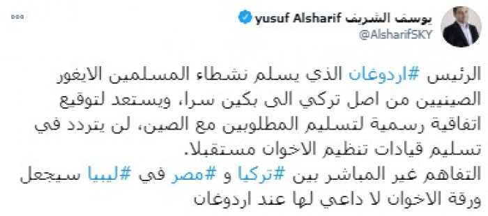 وأوضح في تغريدة على حسابه بموقع التدوين المصغر تويتر، اليوم أن: "الرئيس أردوغان الذي يسلم نشطاء المسلمين الأيغور الصينيين من أصل تركي إلى بكين سرا، ويستعد لتوقيع اتفاقية رسمية لتسليم المطلوبين مع الصين، لن يتردد في تسليم قيادات تنظيم الإخوان مستقبلا".